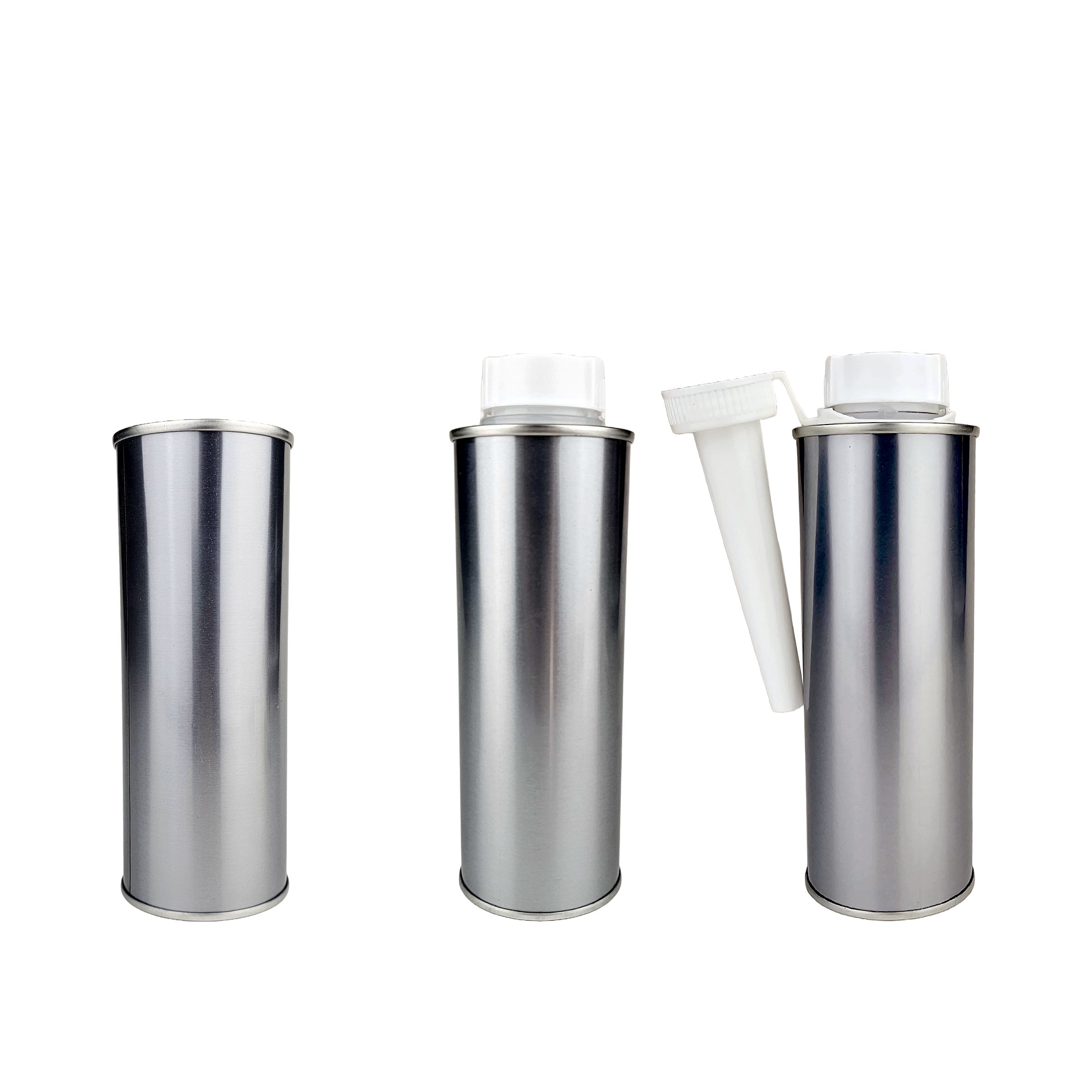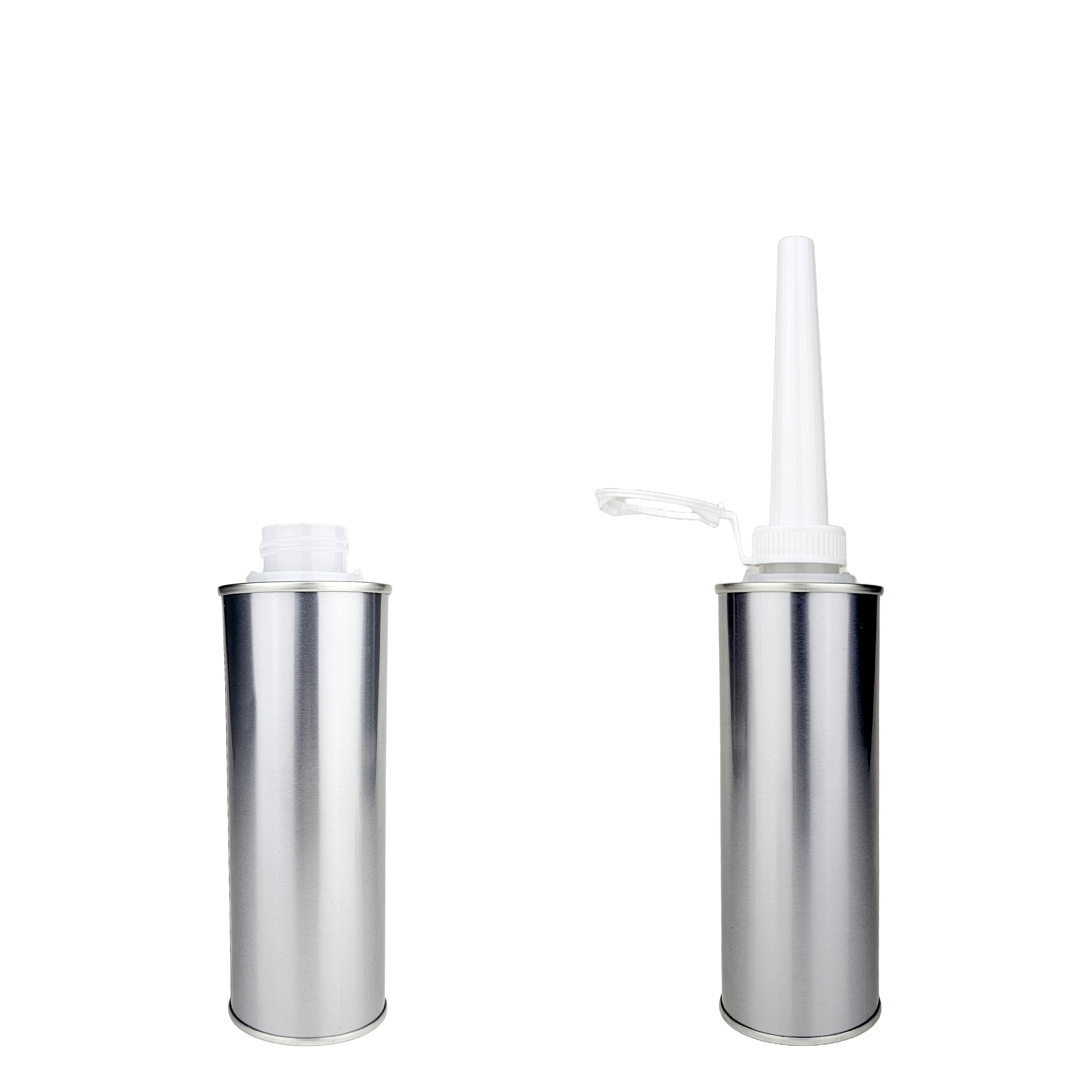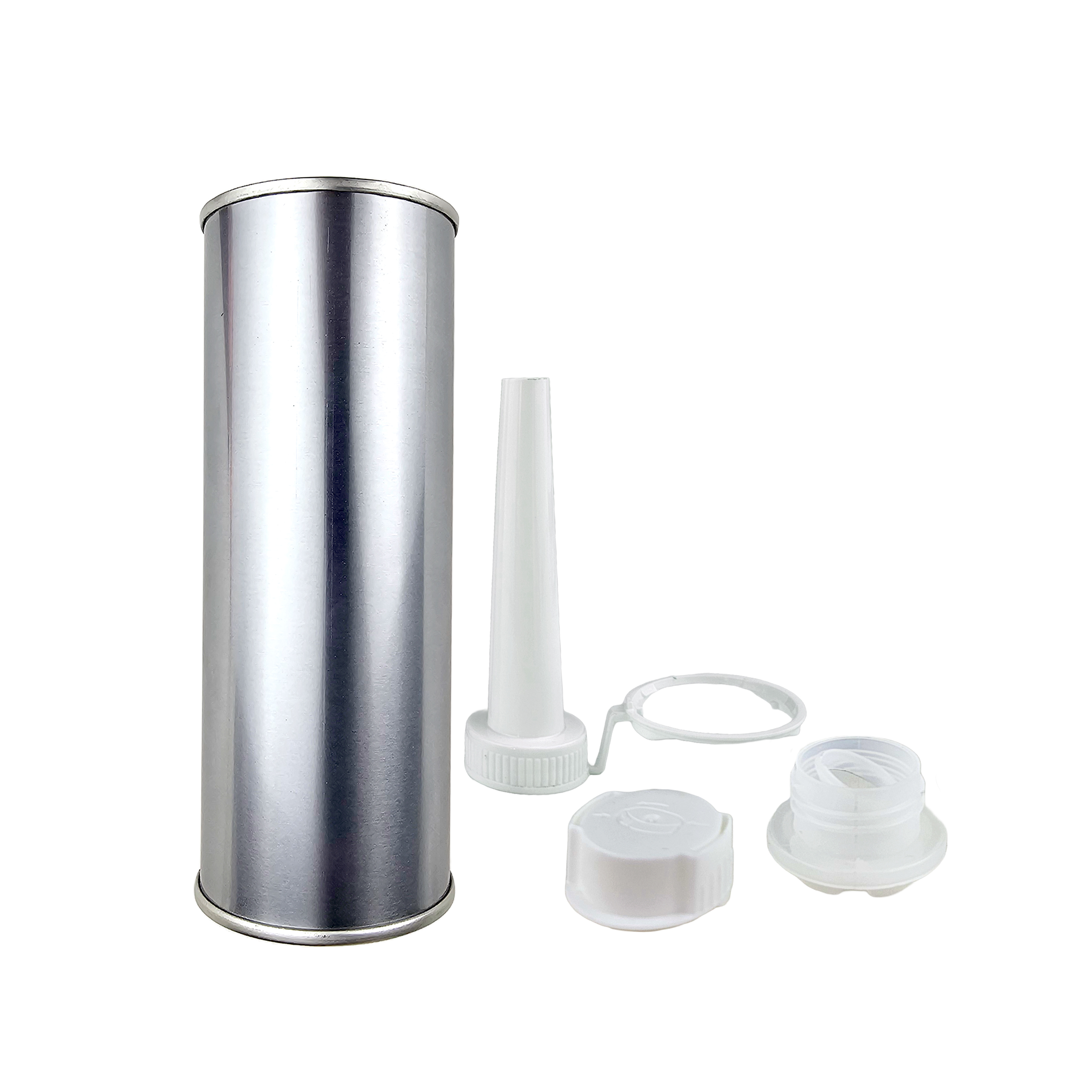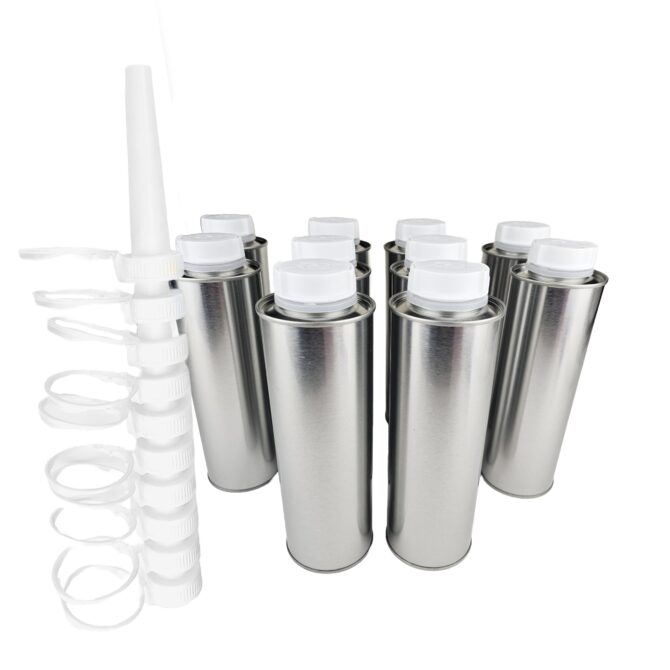Simply add the contents and then push the cap assembly onto the can to seal the contents and create an aerosol-like can with a screw top lid and pull-ring seal. A threaded spout screws onto the can to aid pouring is also supplied.