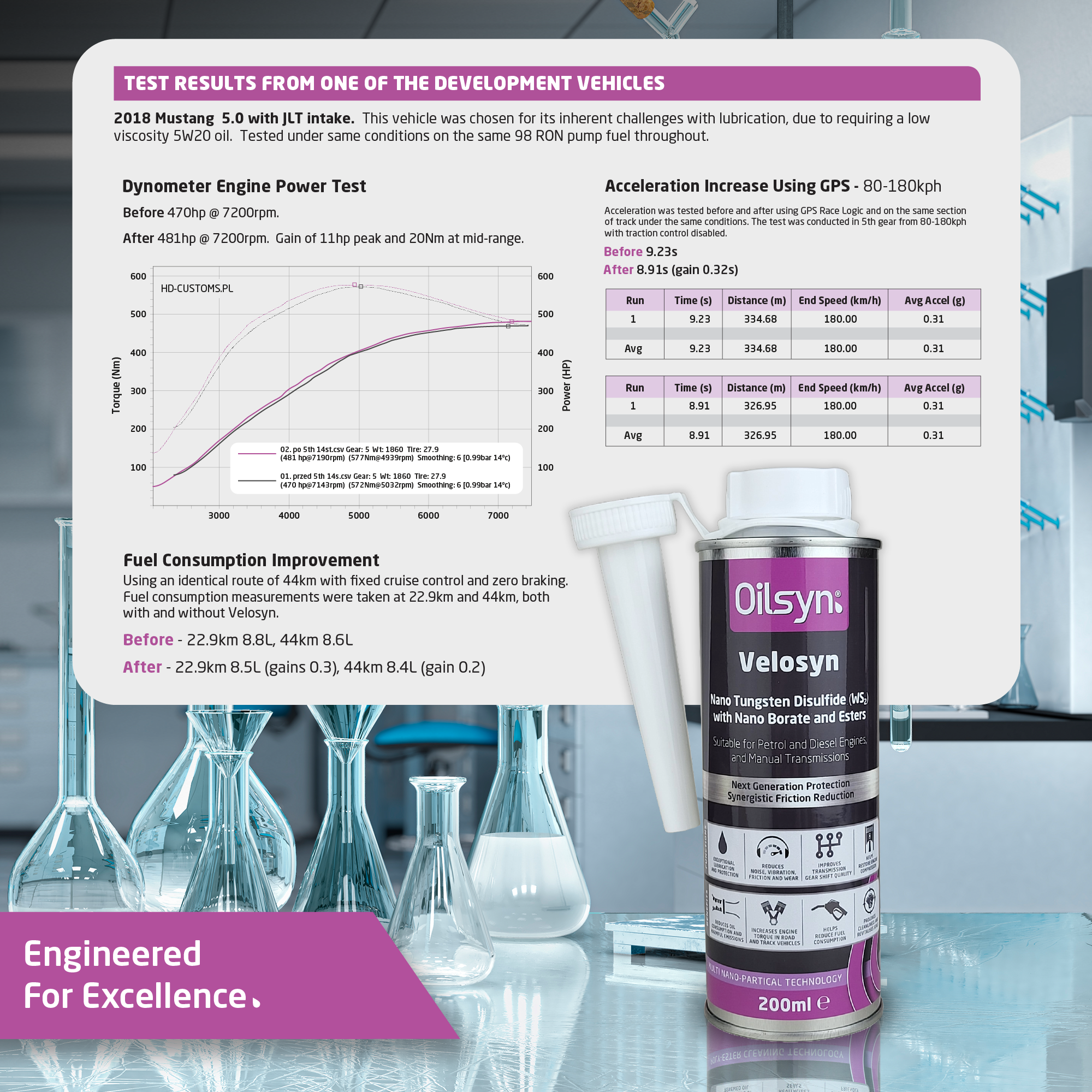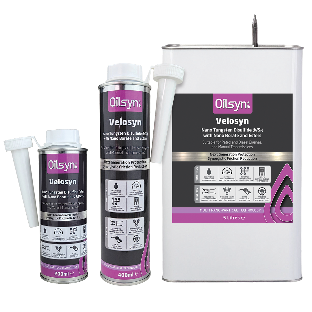It provides an unrivalled balance of protection, wear/friction reduction, and fuel savings through a wide range of driving conditions, from critical cold engine start-up to more competitive full-throttle race conditions, in both petrol and diesel engines. Nano WS2 and Nano Borate are two of the world’s most lubricious substances. When combined, they provide far superior performance to conventional additives. The load-bearing capability is off the scale at over 4,000,000 PSI, and the proprietary synthetic ester delivery package helps Velosyn penetrate and restore part-worn surfaces, reducing friction, wear, and oil consumption. The Nano WS2 and Nano Borate support each other to provide a reliable and consistent friction reduction regardless of oil temperature, engine RPM, or engine load. Oilsyn Velosyn is suitable for all oil types and viscosity classes in petrol or diesel engines, including those with turbochargers, direct injection, particulate filters, or catalytic converters (TWC). Oilsyn Velosyn reduces temperatures in friction areas and improves heat transfer. It performs as a natural antioxidant, extending the life of the oil and reducing deposit build-up thanks to a high alkaline reserve, resulting in TBN (Total Base Number) gain and a reduction in dangerous acidity levels. Veloysn naturally impregnates and strengthens seals and improves their flexibility to prevent leaks and extend their service life.